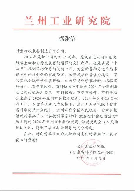 信中提到,2024年5月25日-6月1日,在装备公司的大力支持下,兰州工业研究院(甘肃省科学院兰州分院)、兰州市安宁区人民政府、甘肃科技馆成功举办了以“弘扬科学家精神 激发全社会创新活力”为主题的2024年兰州市科技活动周活动,特向装备公司大力支持和同志们的辛勤付出表示衷心的感谢!装备公司将持续深化科技体制改革,加大研发投入,促进成果转化,全面提升自主创新能力,为兰州市科技事业发展做出新的贡献。