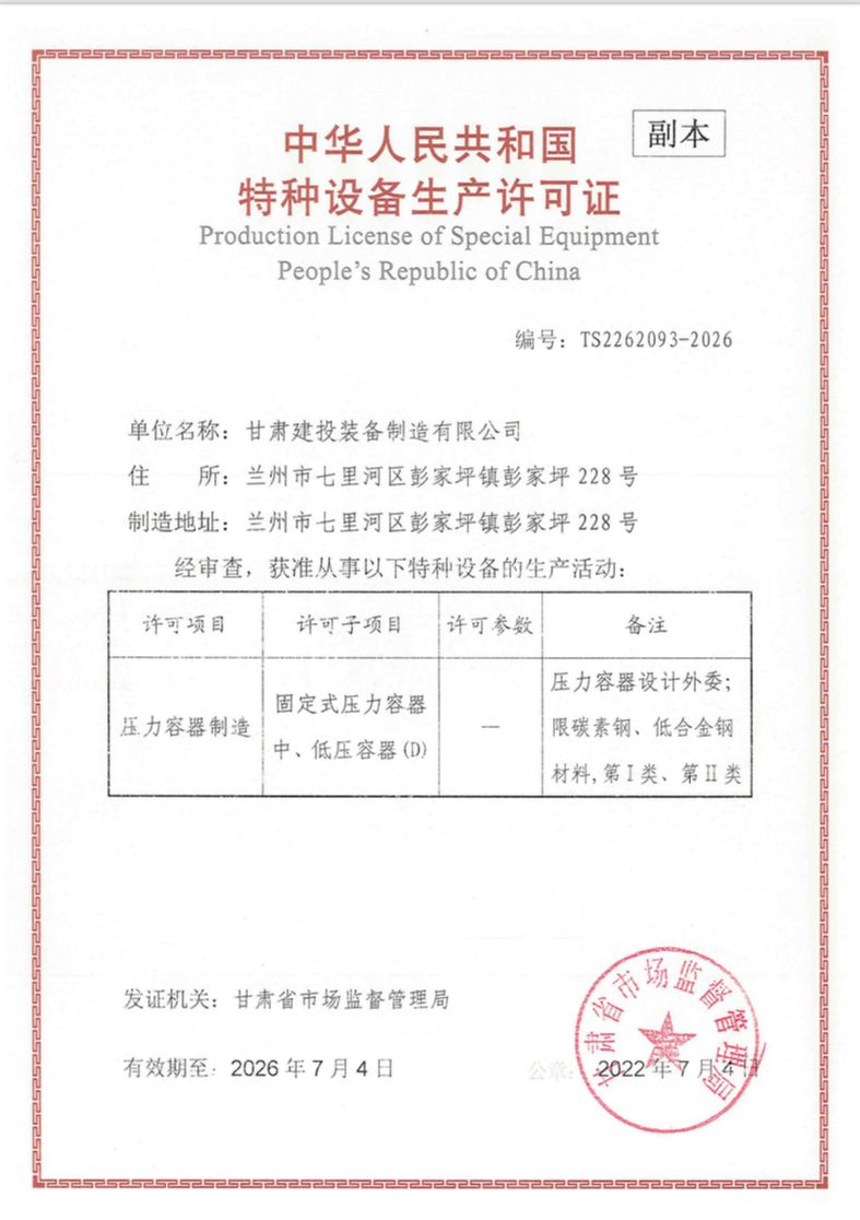 装备公司在对省十四次党代会精神集中学习的基础上,围绕“强科技、强工业、强省会、强县域”的“四强”行动战略,立足做强第一产业这一发展目标,在特种设备资质取证工作上持续发力,于近日成功取得特种设备制造许可证书,该资质可生产固定式压力容器中、低压容器(D)级产品,压力范围0.1MPa≤P<10MPa,包括碳素钢、低合金钢材料第I类、第II类产品。