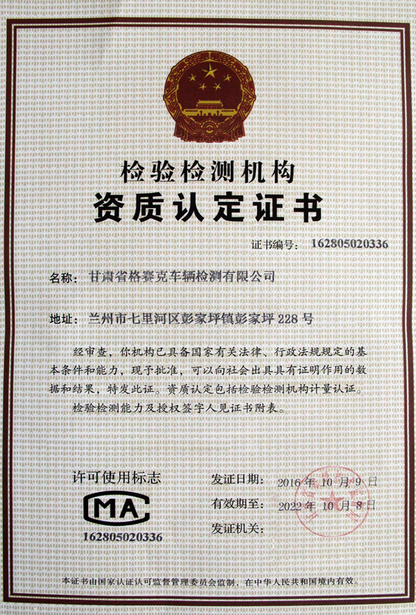 本报兰州讯(通讯员 辛瑞德)近日,兰州市七里河区彭家坪国家级工业园区传来好消息,甘肃省格赛克车辆检测有限公司取得机动车安全技术检验机构检验资格许可证和检验检测机构资质认定证书。