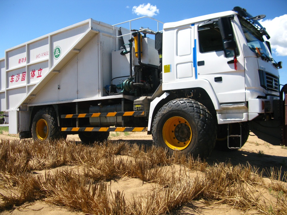 在产品的开发方面,公司前期展开的项目是同北京林业大学合作开发的沙漠铺草机,其方案及详细图样基本确定,将在北京林业大学研究团队所取得的“多功能立体固沙车”(见下图)国家林业局科技成果上做进一步的改进,审核组专家对应也给了相关意见,并表示目前治沙设备在国内外均为空白,市场前景广阔。“多功能立体固沙车”,集固沙、喷播、插条为一身,通过课题研究获得了该类型产品的重要核心技术,形成拥有自主知识产权的“多功能立体固沙车” 系列产品;该类技术与产品将对林业产业技术进步,提升林业机械制造业的核心竞争力,提高林农相关产业、沙产业的发展,起到支撑和推动的作用。 研究团队所取得的“多功能立体固沙车”科技成果,在东北的海拉尔沙地推广示范工程收到良好的效益。