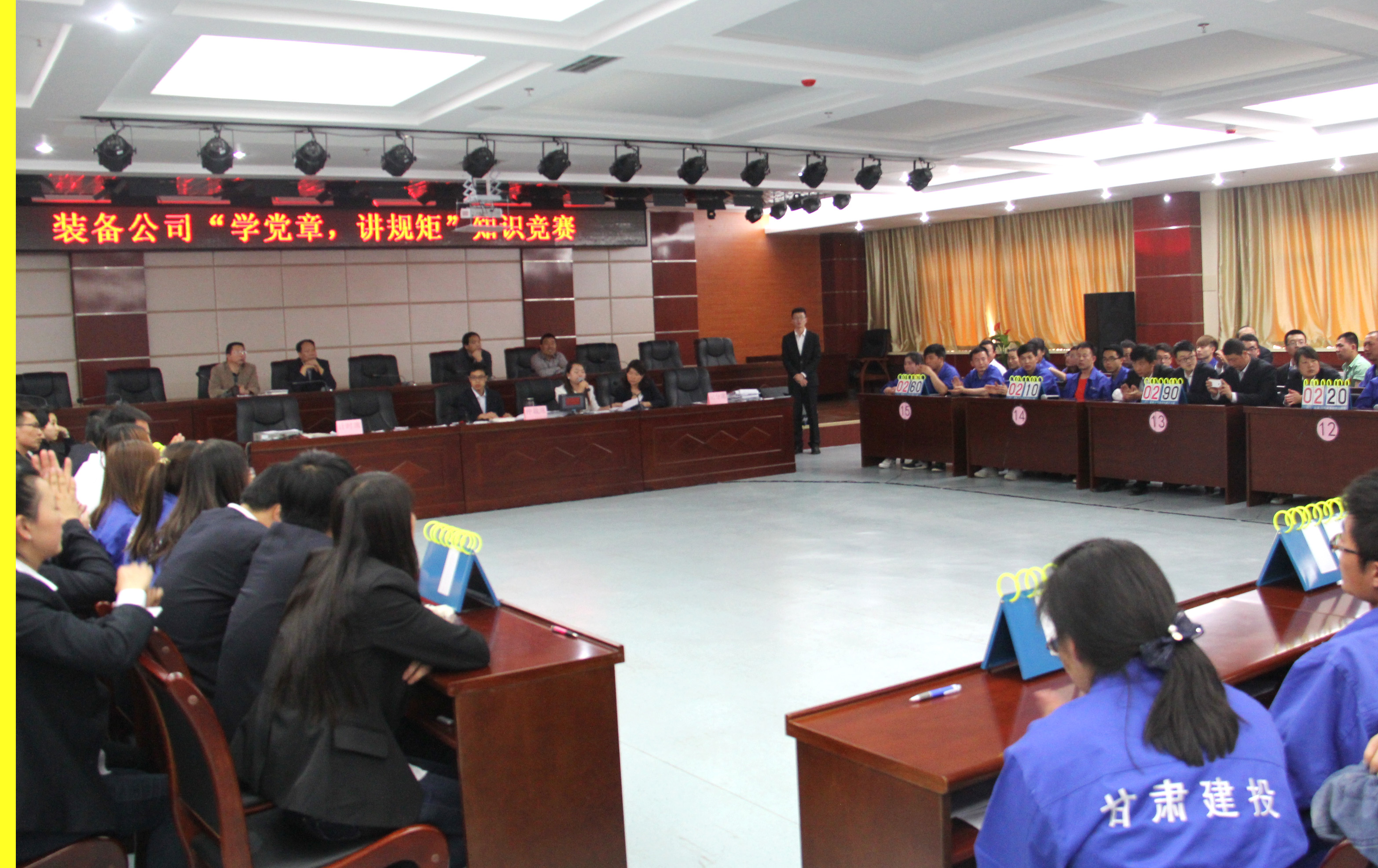 为深入贯彻落实党的十八大和十八届三中、四中全会精神,5月14日,甘肃建投装备公司党委积极安排部署,组织全司员工在办公楼十楼会议室开展了“学党章,讲规矩”知识竞赛活动。装备公司党委书记、纪委书记、党委常委亲临比赛现场并为获胜选手颁奖。