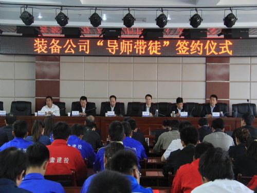 2014年9月25日,甘肃甘肃建投装备公司在十楼会议室隆重举行2014年度“导师带徒”签约仪式。装备公司总经理、党委书记、工会主席、总工程师、生产总监、财务总监出席了此次会议。此次活动由装备公司团委举办,主要目的是通过签订导师带徒协议,引导青年员工在岗位上学习,帮助青年在岗位上成才,提高青年员工的整体素质,加快青年人才的培养,不断提升公司整体管理水平。今天的“导师带徒”签字协议活动共有四项议程。