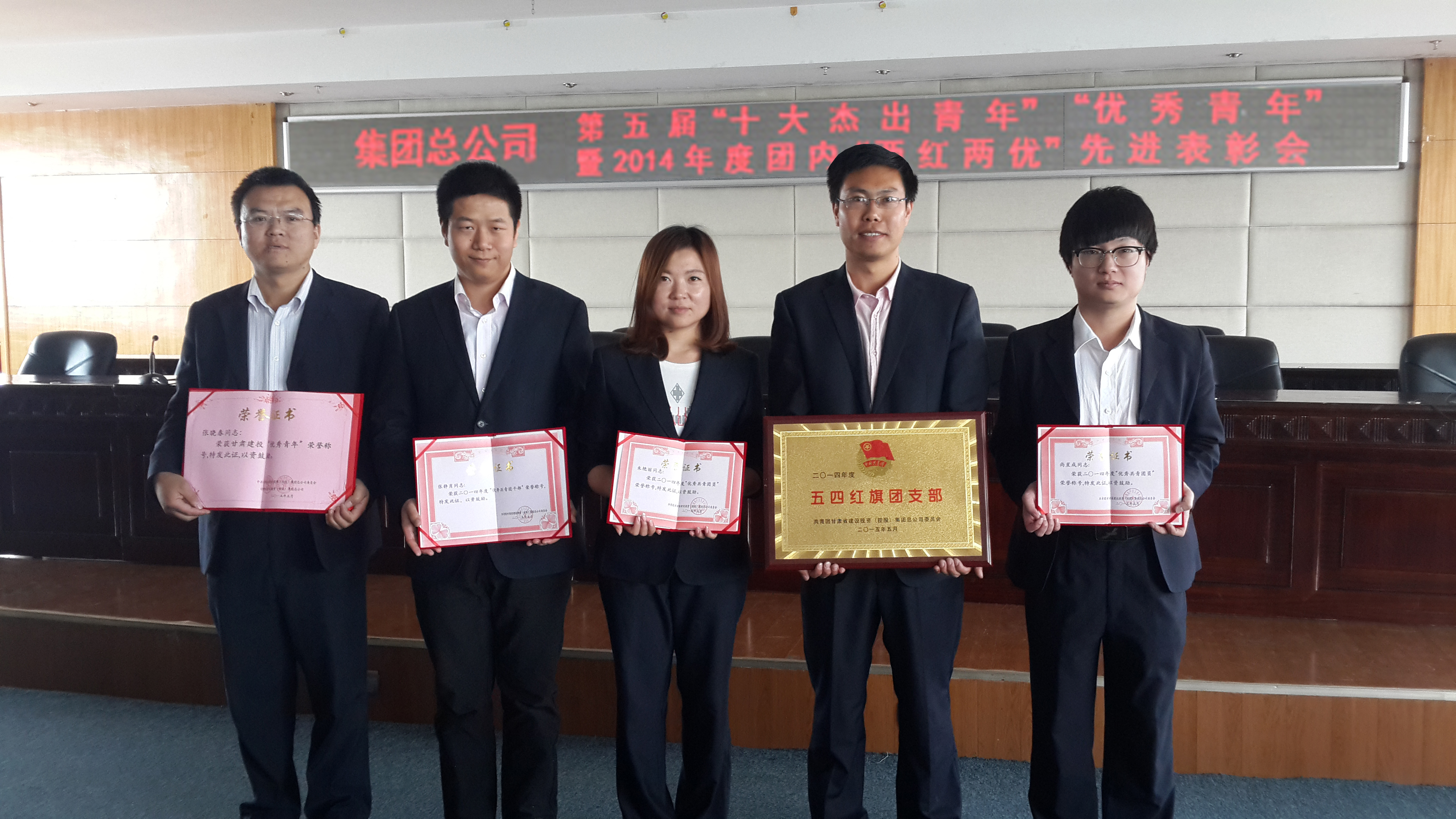 出席本次大会的集团总公司领导有:甘肃建投党委书记宋忠庆、工会主席尹克云,副总经理王世新、边海河、高爱平、杨渺,总工程师冯力强。参加本次大会的还有各分公司先进团支部、先进个人、优秀团干、优秀团员等。伴随着雄壮的国歌声的响起,我们的大会正式开始。首先由副总经理王世新同志宣读《第五届“十佳杰出青年”“优秀青年”暨2014年度团内“两红两优”的决定》,接着由领导为受表彰的先进集体和个人颁发奖牌及证书。为使全司广大青年学有方向,敢有目标,更好的激励广大团员青年热爱企业、奉献企业。此次表彰,其中装备公司张晓春获得“甘肃建投优秀青年”的荣誉称号,装备公司起重机械事业部团支部荣获“五四红旗团支部”,张静肖同志荣获“优秀团干”的荣誉称号,朱艳丽和尚星成同志荣获“优秀团员”的荣誉称号。此次受到表彰的优秀青年具有广泛的代表性,他们矢志创新,在他们身上集中展现了甘肃建投青年职工群体勤于学习、善于创造、甘于奉献的崭新的时代风采。