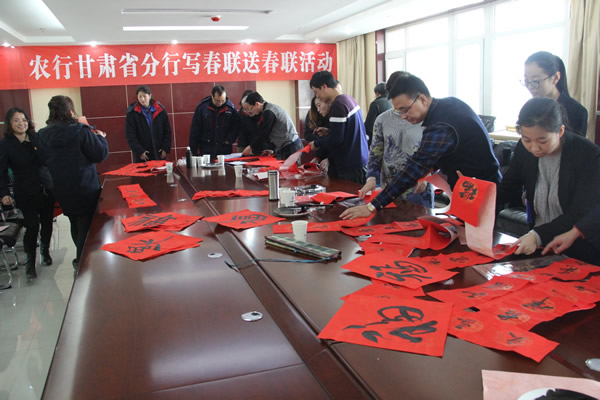 本报兰州讯(通讯员 辛瑞德 樊瑞)2月1日,农行甘肃分行工会组织辖内知名书法家一行7人,到甘肃建投装备制造公司举行了"写春联送春联"活动。此次活动的举办,体现了企业对基层职工的关心和对银企文化共建的美好愿望,增大银企合作共赢空间,进一步打造"春天行动"凝心聚力,奋力拼搏、团结共进的良好氛围。